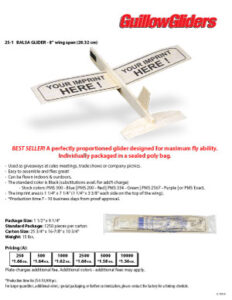 Production times for quantities up to 10,000 are quoted next to each glider.  From 10,001 to 25,000 – Approx. 20 working days from receipt of order & artwork.  Larger quantities, additional colors or special packing please request production schedule.  No imprint orders – 5 days.