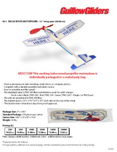 Our Balsa Gliders are printed using letter press method. We print in spot-colors only. 4-color process is not available. Multi-colors can shift slightly when printed. Tight registration is not recommended.